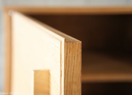 このキャビネットは、アウトセットとインセットの中間的な納まりで、扉の厚みを隠し、インセット納めの際の目透かしも隠すような手間のかかる加工が施されています。