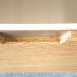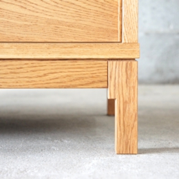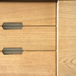 引き出しの引き手もシャープな印象になるような掘り込み引き手、加工の上の特性もあって奥には真鍮のプレートを。
