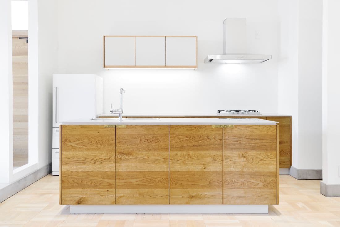 扉など面材には北海道産の節のあるワイルドなナラを使用して豊かな表情を表現します。